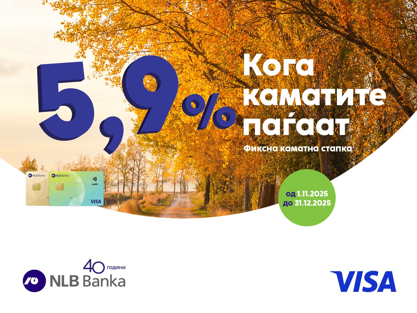 Фиксна каматна стапка 5,9% за сите безготовински трансакции направени со VISA Gold и VISA Classic кредитните картички во периодот од 01.09.2025 до 31.10.2025!